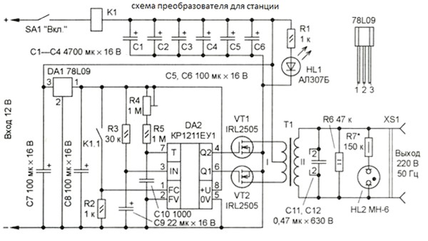Были использованы доступные детали и в целом для преобразователя было потрачено 10 долларов. Транзисторы - 3 доллара каждая ( 2 штуки ), микросхема - 1,5 доллар ( 1 штука ), резисторы конденсаторы - 3 доллара. Трансформатор намотан на Ш-образном сердечке из компьютерного блока питания. С него сначала нужно снять все обмотки и мотать новые. Первичная обмотка намотана 6-ю жилами провода с диаметром 0.5 мм (каждая жила), и содержит 12 витков с отводом от середины. Обмотку удобно мотать жгутом. Поверх первичной обмотки ставим изоляцию из конденсаторной бумаги и мотаем вторичную обмотку, ее мотаем в том же направлении, что и первичную. Вторичная обмотка содержит 140 витков провода с диаметром 0.7мм. Полевые транзисторы типа IRL2505. Задающий генератор выполнен на микросхеме КР1211ЕУ1, частота преобразователя регулируется при помощи резистора R4 (переменный резистор на 1 мегаом ). схема взята с сайта схем нет и расчитана на200 ват но её можно легко преобразовать и на более мощную