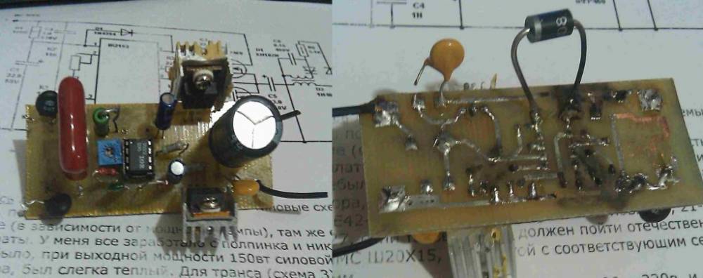 --------------------------------------------- Есть мысль по доработке - поставить термореле на радиатор полевика с задержкой включения ~15 минут(время остывания лампы). Допустим при работе лампы кратковременно отключили свет, поджиг лампы не работает, начинают греться транзюки , при достижении ~80 градусов отрабатывает реле, и питание схемы обрывается, и спустя некотрое время питание снова подается на схему. В принципе можно реализовать на двух транзюках с релюшкой , но придется делать отдельное питание, хотя бы через гасящий конденсатор.