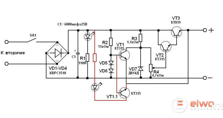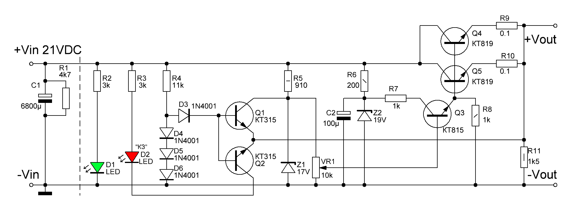 | Намудрил. В итоге получилось следующее: Добавил диод в базу и еще один для компенсации в цепь R4-D3-D4-D5. В итоге при КЗ защита работает как положено. Только бывает при включении при подключенной нагрузке БП может сразу войти в режим защиты. Т.е. сначала надо БП включить без нагрузки, а потом подключить нагрузку (у меня 12В-лампа 5Вт). Далее, после срабатывания защиты, если убрать КЗ, то все равно БП остается в режиме защиты, опять-таки, надо отключить нагрузку и подключить снова, тогда режим работы восстанавливается. Да и еще попробую добавить стабилизацию смещения Q3-815-го. Ну, вроде и все. Спасибо всем, кто откликнулся. :D
