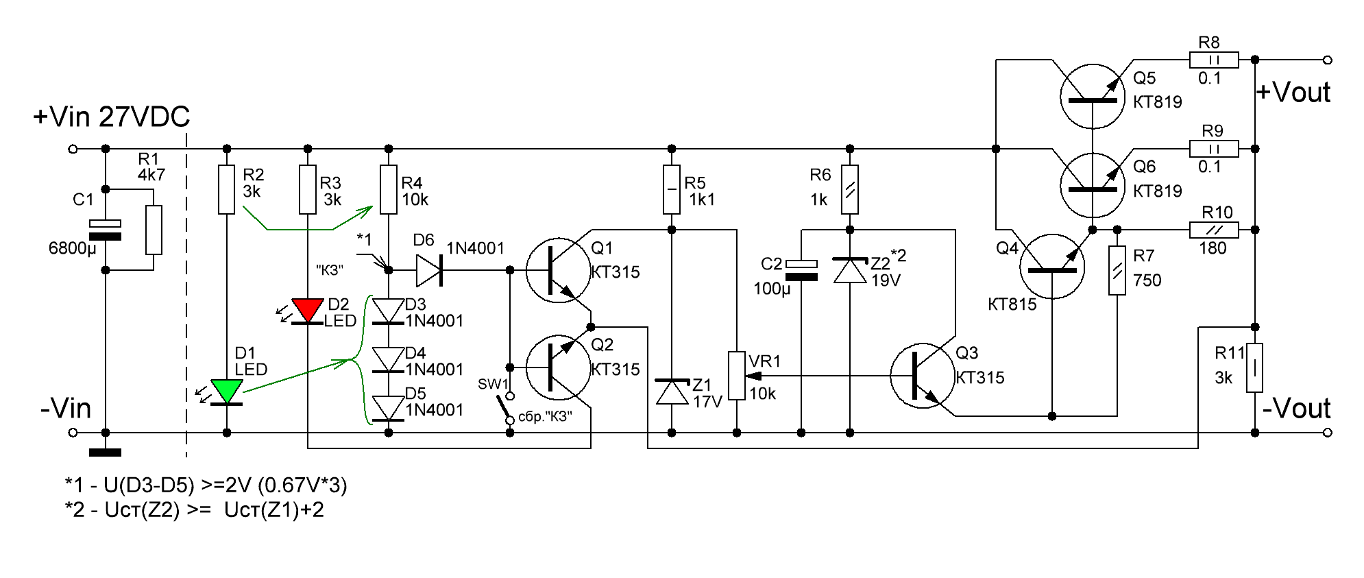 | В общем, вот так лучше: - стабильнее держит выход, при токе от 0 до ~5А напряжение проседает не более чем на 0,6В. Была идея заменить тройку диодов на один зеленый, но потом как-то перехотелось, надо ограничивать базовый ток Q1, а это вызовет падение напряжения на ней (базе Q1). В общем, ну его в баню. И так пойдет. Нижний порог: чуть меньше 1В. Дальше срабатывает защита. Если надо от нуля, тогда защиту придется убрать.