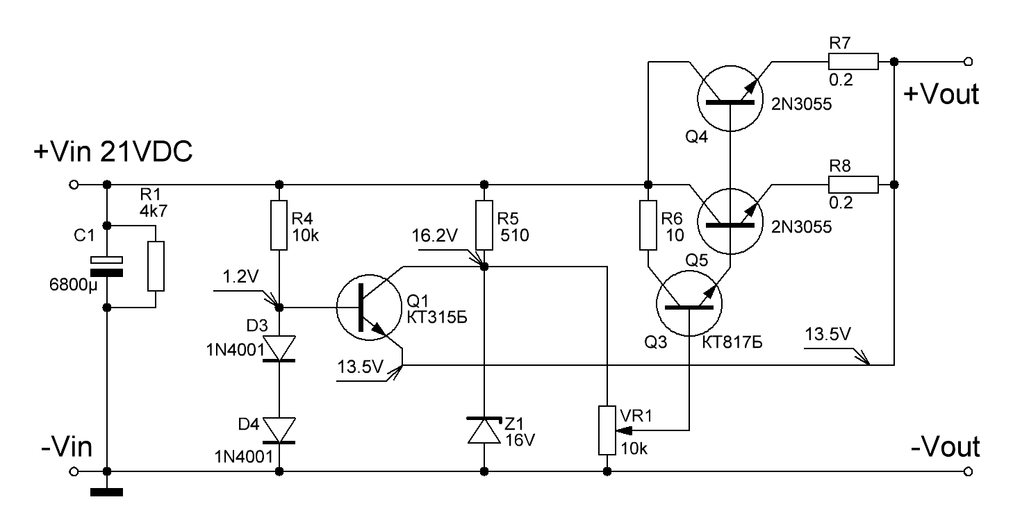 | Ребят, я собрал БП по аналогичной схеме, что привел товарищ Вячеславчик_96, только на NPN транзисторах. Можно ли поставить параллельно несколько умощняющих транзисторов, скажем, 5 штук КТ805ИМ.