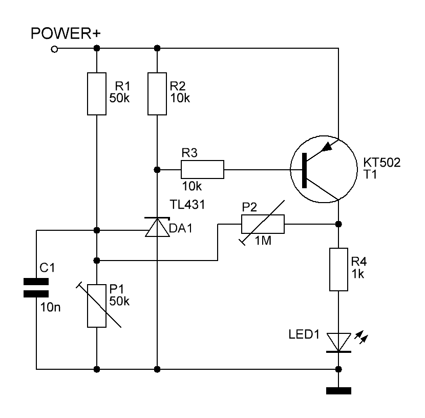 | УРА-А!!! Наконец-то сделал именно то, что надо! И работает так, как надо! Правда идиллию "на одном-двух транзисторах" пришлось развеять. Схема собрана на TL431+KT502. P1 - выставляем нижний порог срабатывания, P2 - глубину ООС и, соответственно, ширину гистерезиса, когда индикатор снова должен включиться. Только при настройке поаккуратнее, чтоб не коротнуть через Р1-Р2 транзистор на землю. Или поставить последовательно с Р2 килоом так 10. Если гистерезис не нужен - то P2 убрать вообще. P.S. Блин, ну и намучался я с этими 431-ми... Сначала отлаживал на двух паяных - глючит, работает в линейном режиме как транзистор - если на У. более 2,5В - открыта, если в диапазоне 2,5-1,9В - TL-ка "плавно закрывается" , менее 1,9В - закрыта полностью, и так обе. Были в запасе еще две, вроде как новые (когда то давно по случаю купленные), ставлю их - то же самое. Думаю, то ли лыжи не едут, то ли я.... чего то не понимаю... Купил еще три штуки, поставил их - заработало как надо. На всех трех. Вот так интересно...