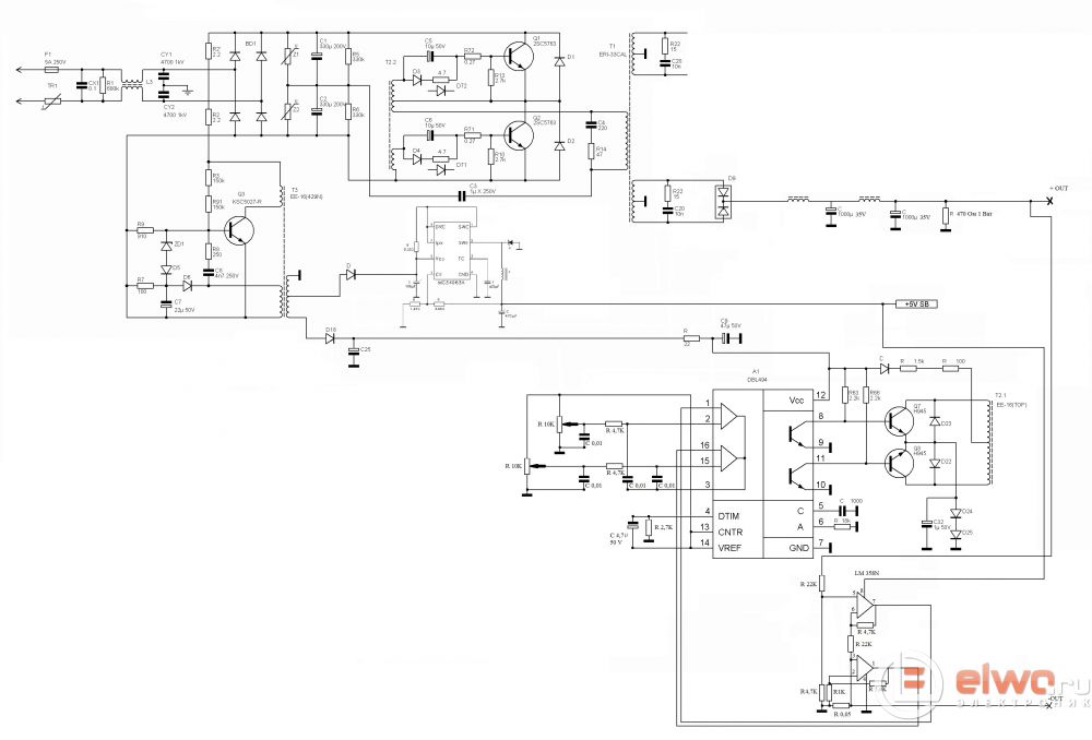 | Здравствуйте. Только не смейтесь, я в первый раз в жизни взял в руки паяльник, а познания в этой области так сказать на уровне интуиции. Вообщем решил я сделать регулируемый блок питания из ATX блока от ПК нашел рабочий блок питания, нашел на просторах интернета схему для переделки изучил так сказать материальную часть и приступил к переделке. Схему от своего блока питания я найти не смог но нашел похожую, (в моем блоке питания дежурные +5 вольт выполнены на аналоге микросхемы MC34063A я схем блоков с такой дежуркой не нашел) но после длительного изучения блока питания разобрался что к чему. Переделывать блок решил вот по такой схеме добавил после выпрямительных дросселей и конденсаторов резистор 470 Ом 1 Ват что бы трансформатор при отключении потребителя без нагрузки не оставался (для них это говорят вредно) и вот что у меня получилось (схему рисовал сам так что не бросайте тапками) в итоге без нагрузки получил регулирование по напряжению от 0,01 до 26,2 вольта подключил потребителя 12V 3 вата регулировка по току тоже работала. Потом подключил 12V 45 ват лампу от автомобиля и тут все чудеса закончились сгорела диодная сборка на выходе из силового трансформатора и силовые транзисторы раскачки. Подскажите пожалуйста, в чем причина???????? что делать??????? и в чем моя ошибка?????? исходный блок питания мощностью 300 ват.