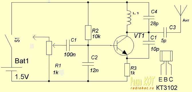 | Quote (jenek34) метров 15 -20 будет Да, примерно так и будет. Вот попробуй так подключить. Quote (jenek34) 96 - 108Мгц вроде в описании написано было... Ну, это наврятли, хотя может и вытянуть Общий находишь омметром, где меньше сопративление с корпусом там и общий. На твоей схеме общий это минус питания. jenek34, не парься с этим радиомикрофоном, да ещё на КТ3102. Максимум он будет работать на частоте 40мгЦ, не выше. Делай этот , MAESTRO, очень подробно его описал, и минимум настройки.