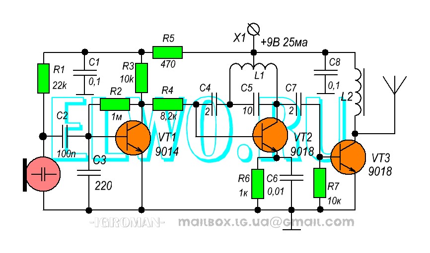 | Quote (-igRoman-) Не плохая акустическая чувствительность, порядка 5-8 метров, Чего не скажешь вблизи. Да, в некоторых случаях если близко говорить от микрофона - возможны небольшие искажения. Но тут уже надо выбирать - либо жучок, либо радиомикрофон. Если вводить АРУ схема усложнится в полтора раза. 2пика - это конечно авангардизм. У меня и на 5пик уже не запускались. Так что это скорее исключение...