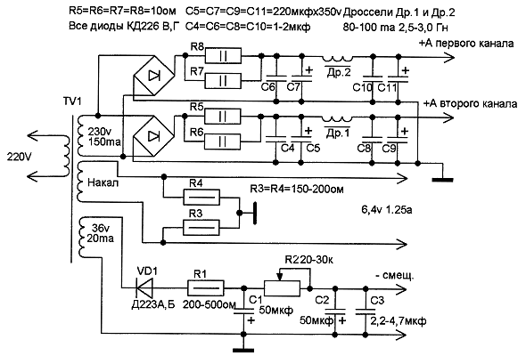 По порядку. Обмотки мотай из расчета чтоб пост напряжение анод-катод на лампе было не менее 300 В., лучше 310--320 В. Ну и ток для стерео мА 300. Если хочешь авт смещ. делать то соответственно учитывай падение напр на катодном резюке. Я б рекомендовал все таки фикс смещ сделать. Проще настраивать по мин КНИ и ИМД. При фикс смещ на 6п6с раб точка выходила в районе - 22 В. Т.е. тебе надо чтоб было напруги пост смещ около 50 В. БП можешь делать как у Манакова. У меня накал один идет для вх и вых ламп один. Так как использовал ТА. И удалось впихнуть туда только одну обмотку провода от ТС 180, которая на 6,3 в и на 4,7 А там. Подпер постоянкой - фона нет. Лучше накал для драйверной и вых ламп отдельно.