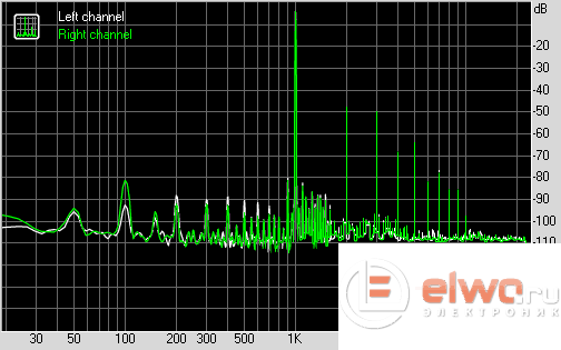 | Вот, к примеру, картинка. Основной тон - 1кГц, самый высокий пик. В идеале кроме него ничего не должно быть. В реале - еще куча, ряд ниспадающих всплесков - гармоник. Чем их меньше - тем лучше. Наиболее заметные гармоники - 2я и 3я, две следующих после основного тона. Очень хорошо, если количество гармоник минимально (3-4) и их уровень имеет вид резко ниспадающего ряда. Кроме того, не забывай о подробных числовых значениях КНИ, я тебе писАл о них. Для лампового усилителя я спокойно воспринимаю КНИ до 1% на максимальной мощности. С КИИ дела сложнее, но в общем все относится и к нему.Добавлено (02.10.2015, 23:11) ---------------------------------------------