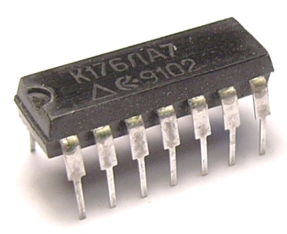 | Вот берём эту микруху К174ХА10 и нагло отламываем выводы с 1-го по 8-й и ещё 13-й. Вид микросхемы ниже. Цоколёвка такая - если смотреть на выемку полукруглую сос стороны надписи, то снизу слева 1-й вывод и пошли вправо - 2,3,4... Дошли до правого края и шагнули прямо вверх - это 9-й. И теперь считаем влево - 10,11,12.... Оставляем копыта 9, 10,11,12,14. Паяем к ним вот что: 9- вход от регулятора громкости; 10- конденсатор 100микрофарад на минус; 11- минус питания; 12- через конденсатор 100 микрофарад на динамик (другой конец динамика на минус); 14 - плюс питания.