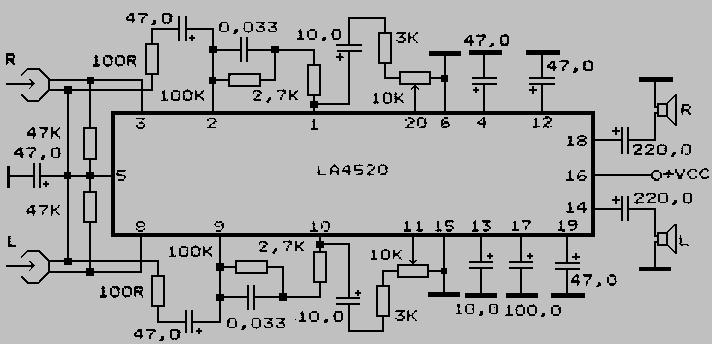 | А кто нибудь может подсказать простенькую схемку усилителя на микросхеме LA 4520. Заранее благодарен.