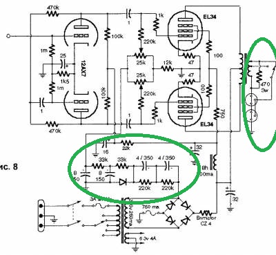 я думаю сперва на тан1 попробовать, если понравиться продать и собрать уже для себя на выходном хаммонд. я смотрю в статье 2 схемы по какой лучше собирать? на каких лампах, есть и ел34 4шт подоброные и 6п3с не подобраны. вход на каких лучше собирать, и еще не понятны вот эти две вещи на фото зеленым
