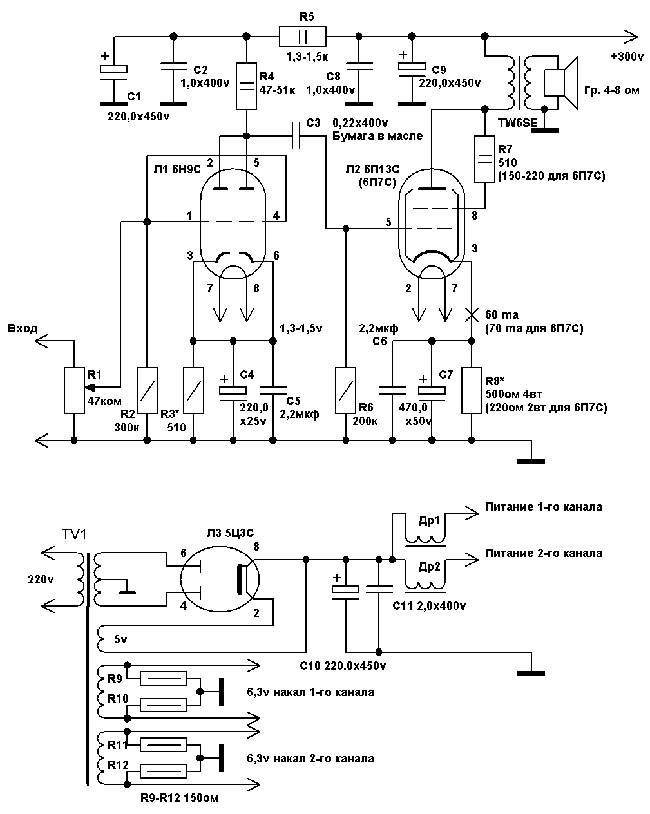 | он проигрывает по звуку басу и в 2 раза по громкости, усилителю на 6ф3п. что я мог сделать не так, усь работает отлично в полной тишине фона нету (ухо в плотную к динамику прислонял) собрал все как по схеме на выходе tw6se может я питания не так сделал, у меня к дросселю 160в идет того