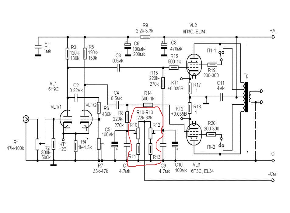 | Gamzan со всем вроде разобрался осталось 2 вопроса: 1) в питание R1, R2 5ом 2вт они ведь параллельно, не проще 1н поставить 2.5ом 5вт, или надо 2 ставить? 2) в схеме одно место не понятно выделил на фото красным цветом. резистор R11,R13 22k-33k. R10,R12 тоже 22k-33k ???