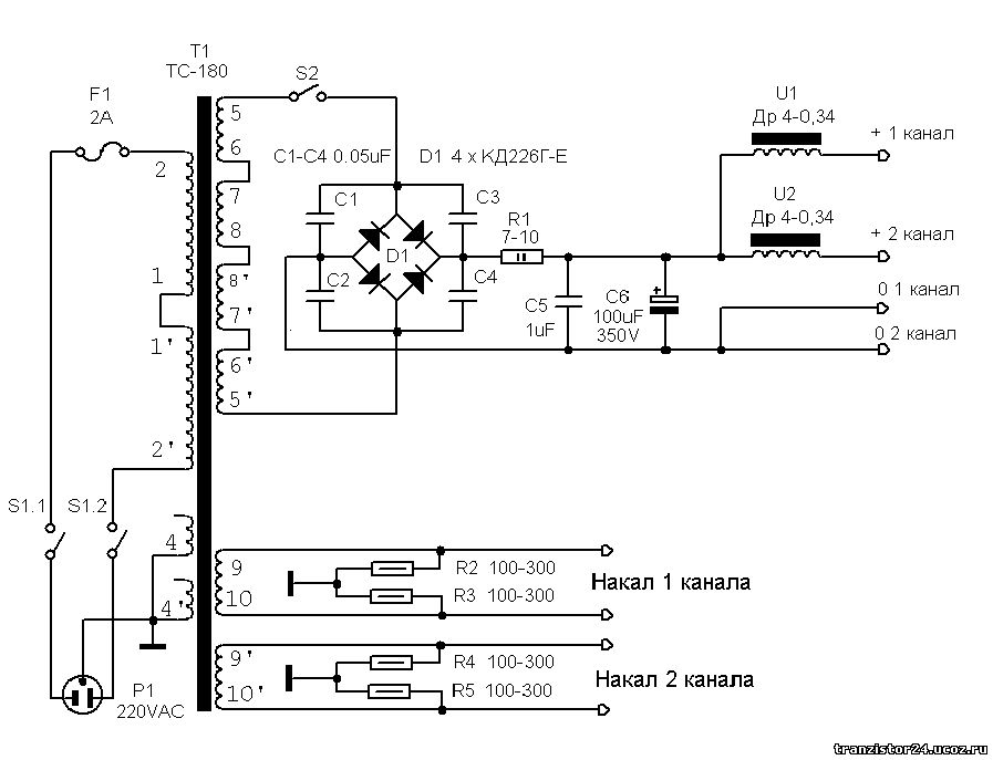 | Точную схему подключения обмоток расписывать не стану, об этом можно почитать в справочнике, скажу только что для той схемы надо получить анодное напряжение (общее для обеих каскадов) 300-350В.