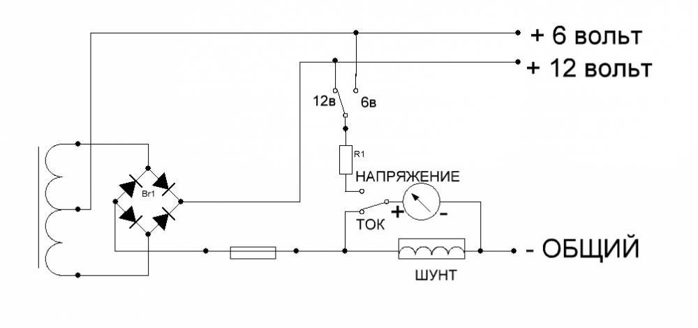| Если не будешь заряжать шестивольтовые то можно схему не переделывать.Я тебе нарисовал новую для того чтоб можно было контролировать ток и напряжение не только при зарядке 12 вольтовых акумов но и шестивольтовых.Почему на минус поставил измерительную часть?Потому что именно минус является общим проводом как для шести вольт так и для двенадцативольтовых. Повторюсь.Если не будешь использовать для зарядки 6 вольт,то не нужно переделывать. А теперь посмотрим на твою схему.Один провод от прибора идет на центральный контакт переключателя Больше к этому выводу прибора ничего не подключено.На другой вывод переключателя садится провод от шунта и плюса моста,на третий контакт гасящий резистор(который у тебя греется).Все,что здесь еще не понятно? Почему вольтаж меняется на выходе зарядного при разных положениях переключателя?Потому что при включении режима ВОЛЬТМЕТР,у тебя гасящий резистор,подключается паралельно выходу зарядного устройства и уже происходит падение,и соответственно греется резистор. Ты писал что все работает.А чтож показывал у тебя прибор на вольтах?Я сомневаюсь чтоб он показывал что то. Делай согласно схеме и все будет работать.