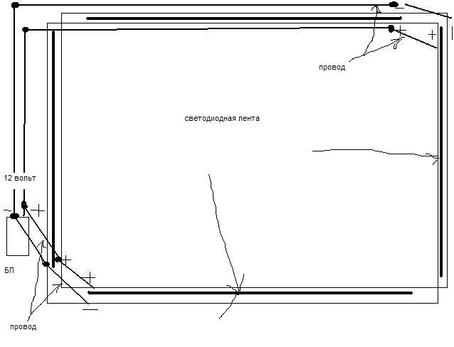 | Plamya, в начале каждой светодиодной ленте есть обозначение + и - (это полярность напряжения) в блоке питание вашем тоже есть + и - нужно соединить все плюсы и минусы светодиодных лент (делается это с помощью проводов пример как на рисунке (соединять ленты в одну большую нельзя ибо проводники этих лент не рассчитано на большую нагрузку)