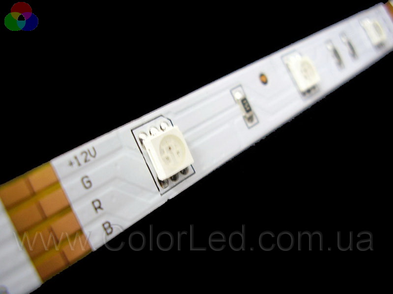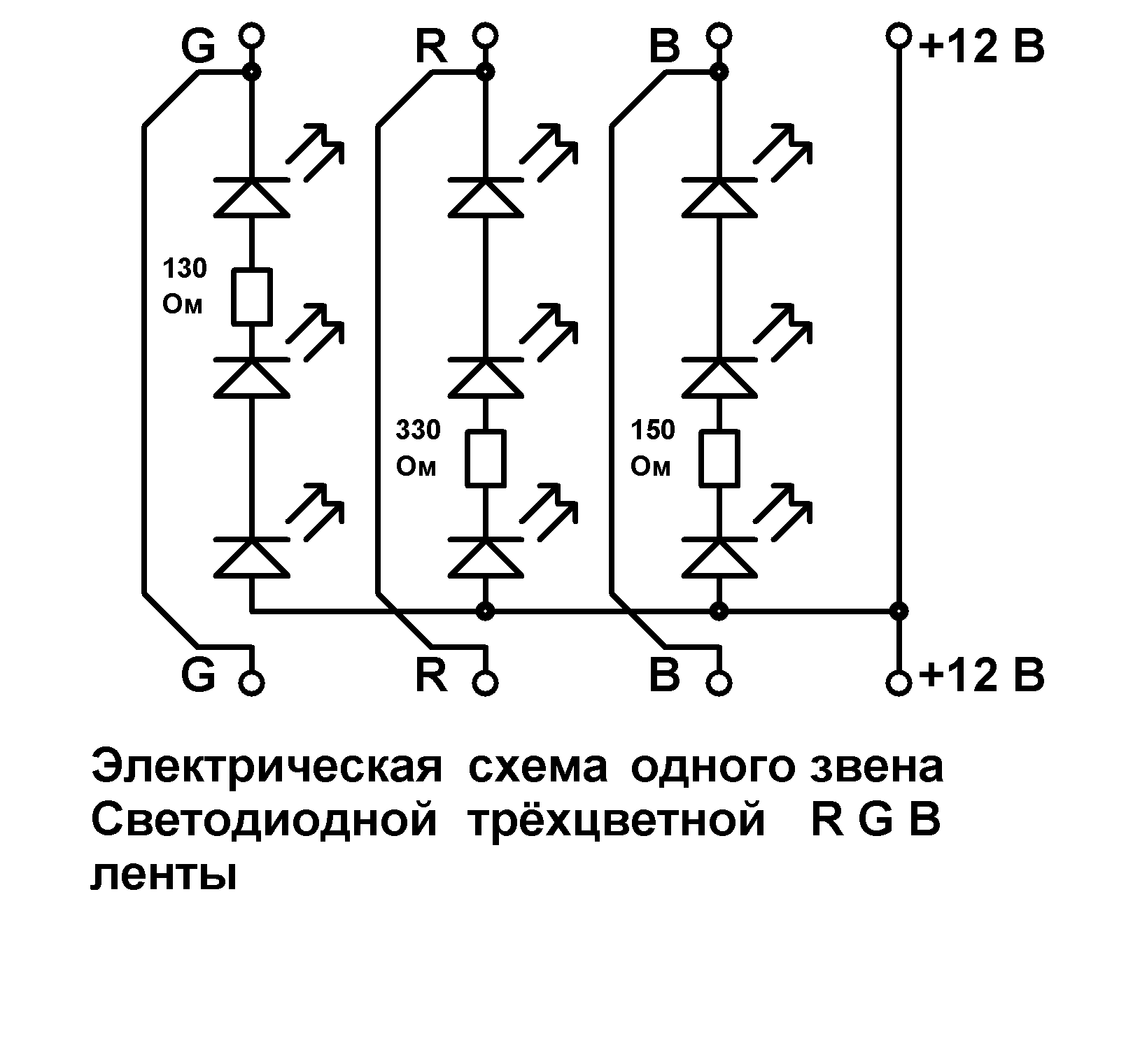 | На днях делал для выставки подсветку из ленты RGB 12 вольтовой,под мебель,будет выставляться в Москве,и остаток ленты-содрал силикон,отмыл ацетоном краску,и срисовал саму схему подключения светодиодов в ленте. Добавлено (20.11.2011, 20:20) --------------------------------------------- Номиналы сопротивлений не опечатка.Скорее всего это сделано для того,что бы лента при 12 вольтах на всех трёх выводах,могла светится белым цветом.