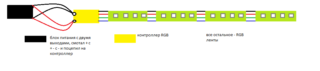 | Добрый день, помогите решить проблему: 1. RGB лента подключена к контроллеру, контроллер соответственно к блоку питания, при уменьшении яркости свечения с пульта до минимального значения лента начинает мигать, причем мигает только при самой низкой яркости и еще на каком то одном значении, если яркость прибавляешь то светит ровно. Сначала была подключена одна лента, все было хорошо, потом припаял к ней последовательно другую, припаял не оч хорошо и контакты немного замыкали но вроде исправил, стали мигать на небольшой яркости, потом вторую ленту оцепил но проблема не исчезла. Проблема с контроллером или с самими диодами?...или может с питанием?...или может из за того что криво спаял ленты? 2. общая длинна короба - 7м, диоды нужны в два ряда (14м), подключил ленты последовательно одну к другой, свободный конец ленты в контроллер, контроллер в блок питания (кстати проблема 1 возникла после присоединения 2й половины лент)..может надо как то подругому?......схему как сумел нарисовал, понимаю конечно что проблема изначально в моих кривых руках, но все же может есть способ узнать что именно случилось?