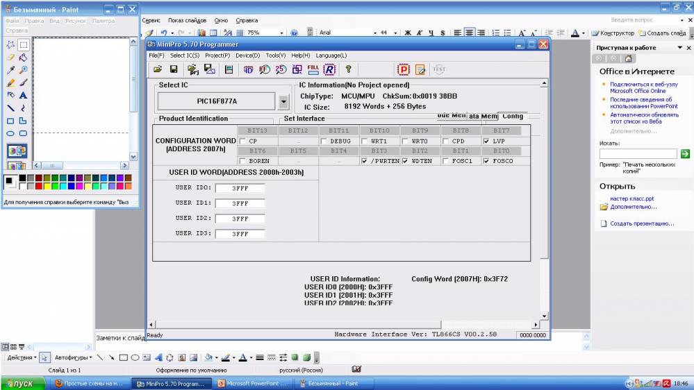 | reader_W, в моей прошивке проставлены биты HS и РWRTE. То есть, HS (или HI) - это внешний кварц. В нашем случае это кварц на 20 мГц. PWERT - это включение внутреннего таймера. Все остальные биты нужно просто отключить (убрать птички и галочки) Я такой программы как у тебя ещё не видел. Я пользуюсь программатором PicKit2 c одноимённой программой или программатором ExtraPic с программой WinPic800. Чем я могу помочь?