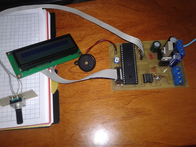 | reader, проверь правильность подсоединения проводов от LCD к плате. Потом настрой контрастность резистором, подключенным между 1-2-3 выводами дисплея так, чтобы эти квадратики не высвечивались. Без контроллера на дисплее ничего и не будет видно. Поэтому сначала прошей контроллер, а перед прошивкой проверь биты конфигурации HS и PWRTE. (хотя я их установил в самой прошивке) Кварц в плате стоит такой же, как и на схеме? А-а-а!!! я только сейчас увидел, что кварц на плате разведён, а в схеме не нарисован. MAESTRO, замени, пожалуйста схему на вот эту, исправленную.