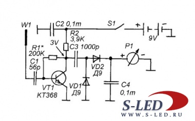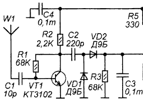 | Все так Чтоб был полный фарш, и стрелка гуляла на полную придумали усилитель высокой частоты УВЧ. Хотя бы на одном транзисторе. Добавишь к своей схеме и будет порядок. Измерительную головку подключишь к С3, R3 можно не ставить.