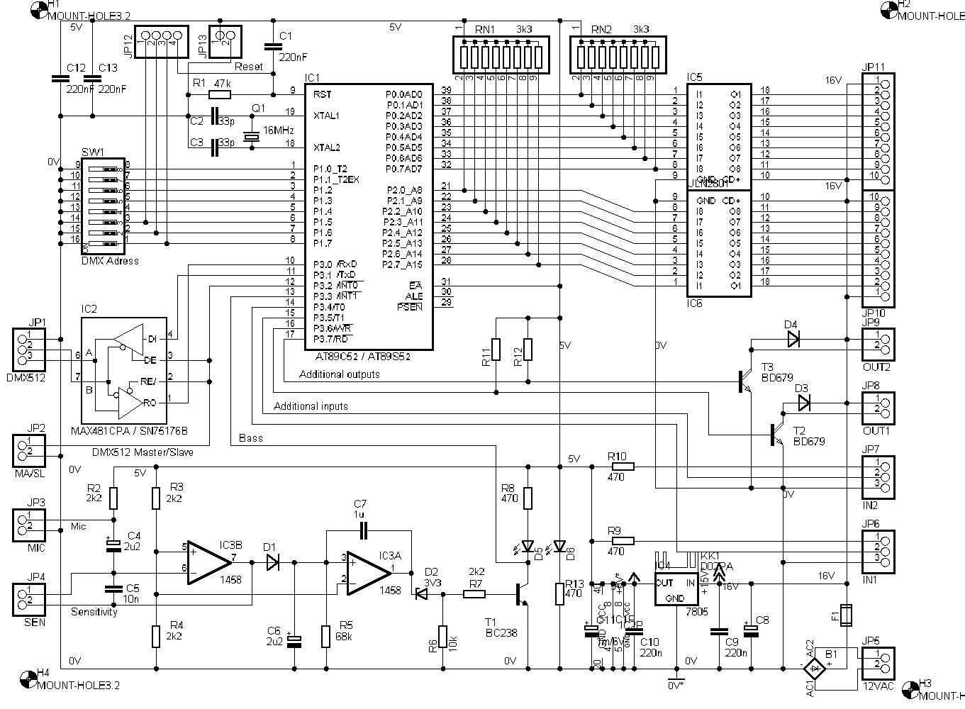 | Quote (DjBraga) А гобо где брал? номинал L1, что за ntc 1 , какой контроллер. а у тебя не ошибка в схеме сторобо не JP9 а JP8 1. Извиняюсь, выложил не ту силовую схему на лампу. Исправил. Симистор управляет электронным блоком питания. Он был на 12 В 200 Вт. Я его переделал на 15 В, применил лампу с отражателем от медицинских приборов 15В 150 Вт. 2. Последовательно с лампой стоит термистор (NTC1), чтобы лампа плавно загоралась и не сгорела (все-таки стоит около 500 руб). Вот такой http://www.chipdip.ru/product/jnr20s0r7m.aspx 3. Ошибки нет. И на JP8 и на JP9 можно повесить и строб и управление движком призмы. Разница этих выходов только в том, что в одном на выходе 1 при значении DMX 0-127, а 0 при DMX 128-255. А в другом выходе - наоборот.