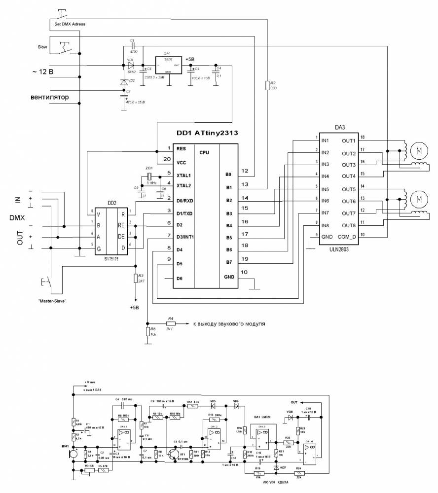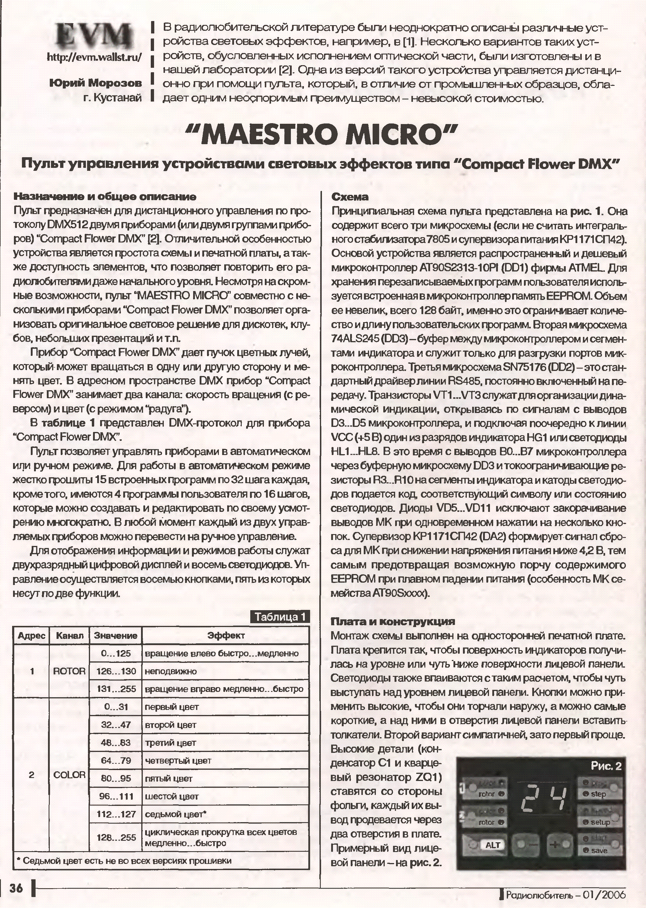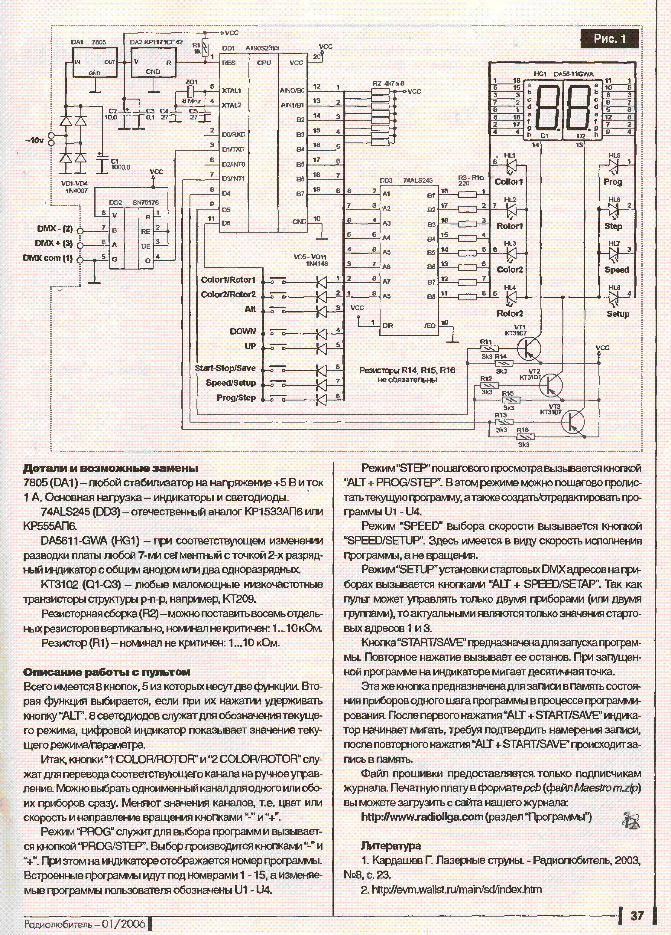 Ну и помучился я с этим пультом. Оказывается в журнале выложена прошивка под другие назначения выводов контроллера. Я общался с автором, он выложил (по-моему в более позднем номере журнала) исправленную схему. Но я к этому времени уже спаял плату и мучил ее с месяц. Так автор кинул другую прошивку под схему, которая была выложена в журнале с самого начала. После этого у меня все заработало. Неплохой пультик. Только им можно управлять только этими приборами и только двумя (или двумя параллельными группами).Добавлено (29.02.2012, 22:15) --------------------------------------------- Вручную управлять хорошо, если ведешь какую-то презентацию, концерт. Я-то делаю для себя, для дома. Поплясать с гостями, на работе праздник отметить. Поэтому сканеры гоняю через программу Фристайл от ноутбука. Вот только скачать бы где-то руководство (инструкцию) как всем этим пользоваться. А то осваиваю методом тыка.