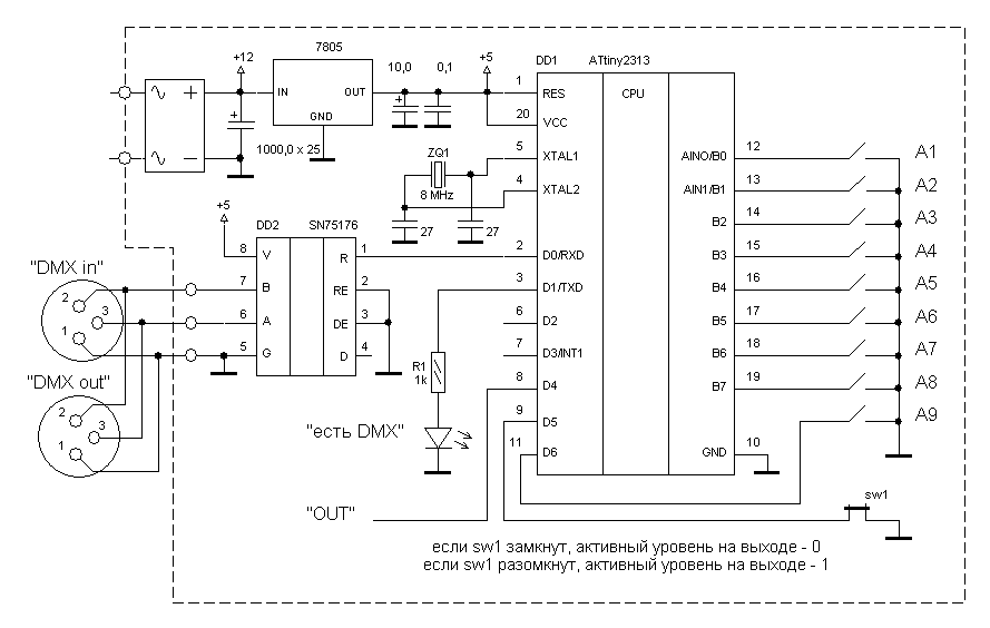 | Хороший генератор тумана, но не хватает управления по DMX. Как его сделать? Я решил собрать свитчер по такой схеме: Только 9-й дип решил не ставить. Врядли у меня будет 1024 адресов DMX. Оставил 8 дипов (512 DMX адресов). а это прошивка