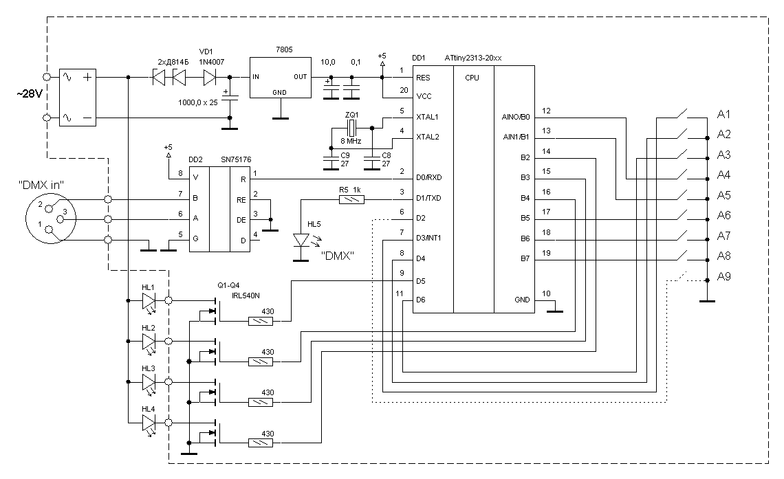 | Представляю на обозрение схему RGB светодиодного прожектора. Есть схема, прошивка. Плату нарисовал, но это не составит труда никому. Пока только собираюсь спаять, задержка только из-за того, что не могу найти подходящего красивого корпуса, похожего на маленький прожектор. Схема, конечно не моя. Ее выложили спецы по световым приборам на форуме, который прикрыли (может быть как раз из-за того, что слишком много секретных схем с прошивками выкладывали на всеобщее обозрение). Надеюсь, что авторы не обидятся, т.к. не было такого условия, чтобы хранить это в тайне. И им, этим авторам отдельное ОГРОМНОЕ спасибо за эту схему.