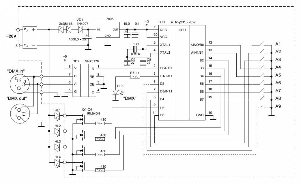 mont, в случае светодиодных лент ограничение по току обеспечивается резисторами, которые, как правило, уже есть на ленте. Если же юзаете серьезные светики, то вместо транзисторов Q1-Q4 ставьте драйверы светодиодов, имеющие вход регулирования, с соответствующей обвязкой (смотрите даташит). Насчет внутреннего генератора 8 МГц - не советую, ибо очень не стабилен и c приёмом DMX будут проблемы.