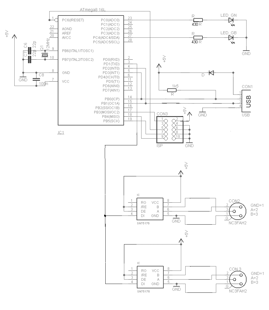 | Вот другая схема USB-DMX на ATMega8. Тут-же прошивка Тут-же драйвер u-DMX и печатка Чтобы проги работали нормально с uDMX, надо после установки драйверов uDMX.dll еще скопировать в директорию Windows \ System32\ В схеме неправильно показаны выводы на разъем DMX. Нужно 2 и 3 выводы поменять местами, т.е.: - с вывода 6 SN75176 на вывод 3 DMX - с вывода 7 SN75176 на вывод 2 DMX
