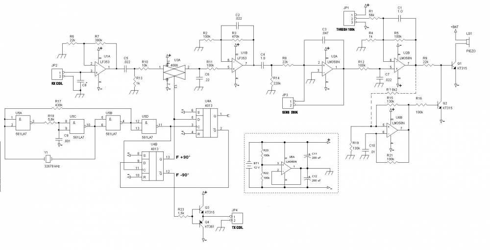 | Подключил ради интереса по 9п. и 10п. кондеры параллельно катушкам. Свел катухи до 35мВ на халяву... (хотя наушником писк терял на 1 ноге). Час гулялся: регулируя трэш до половины молчок... монетой поводил см10 -чует гад! крышку от кастрюли см 30-40....при изменении треша дальше слышится как бы самовозбуждение (генерирует звук). Сразу вопросы или мои выводы: 1)конденсаторы параллельно на обоих катушках? 2) Тх расположена снизу Rx? 3)заливать цанлаком(только он и есть у меня) уйдет ноль( сводить друг к другу снова придется)? 4) R7 менять с 390к до 1м? исп-л LM358 (или потом уже после заливки катух) 5)чуть подкрутил переменики чуйка чуть выше на монету см15 но фыракает не приятно -как буром в зуб у стоматолога. Когда включаю питание слышится легкий гул в наушнике. когда подношу монету гул прерывается и слышится фрр-фрр. подношу ближе фрр -громче.....а можно тональность изменить (тоже апосля резистором каким) ну ладно...еще дорабатывать и хочется к звуковухе подключиться еще будут вопросы...феска, не надоело тебе ...вот терпение.. 6) радиолюбитель. объяснил: умотать, свести, пролачить ( а ноль уйдет, может кусочек не долачивать, оставить для подстройки) а экран когда...чуть запутался