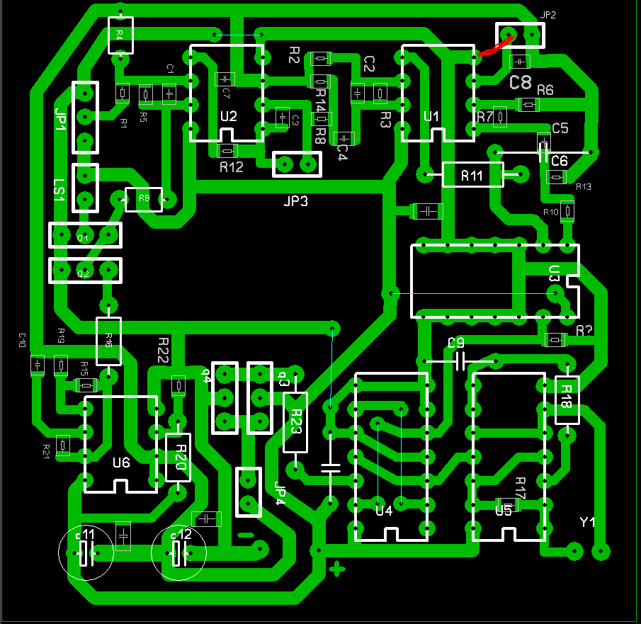 | феска, У меня такой вопрос! У меня два кантакра замкнули отметил красным на рисунке!После этого JP3 перестал реагировать на денамик! Ток на ТХ уменьшился был 3в стал 1в !На прикосновения пальца не реагирует микросхеа U4 ! Динамик пищит в любом положении регулятора JP3 ,а не как в описании на крайнем полодении JP3 ,а JP1 ГРОМКОСТЬ РЕГУЛИРУЕТ! В чем может быть дело?