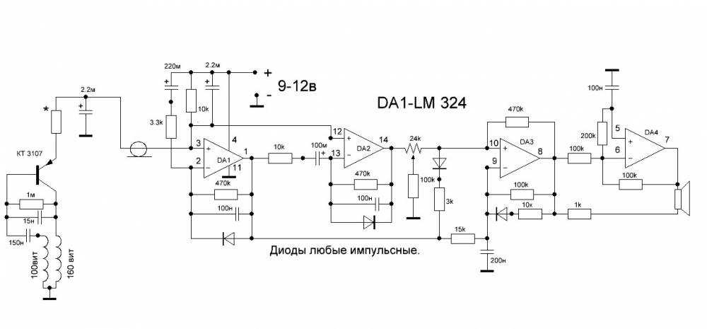 | shindr На картинке 1115382.jpg(57Kb) схема адаптирована под TL074 , а для LM324 схема с авторскими номиналами, ну и моими поправками  Добавлено (23.03.2012, 21:41) --------------------------------------------- stream3 Транзистор пробовал, лучше всего подошел КТ3107Ж с усилением 230 ,замерил цифровым тестером.